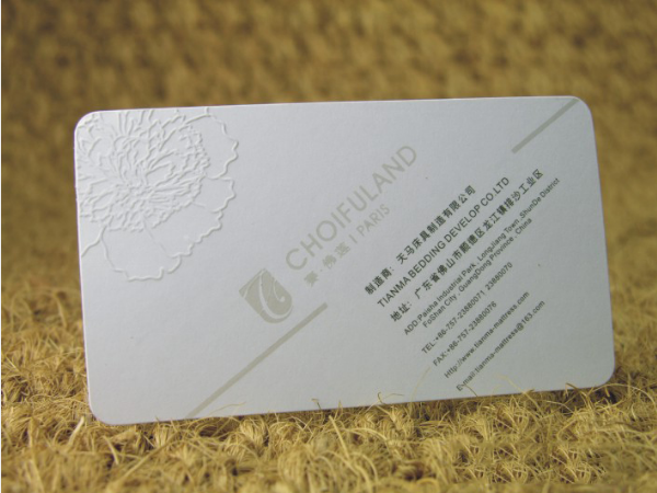 采用凸字工藝制作,凸字工藝的效果從視覺上看讓“字”或“圖形”更加有層次感,加工時采用**進口樹脂凸字粉,使凸起之處更加晶瑩剔透。凸字是對文字和圖案做工藝,將文字和圖案突起在名片紙上。凸字前先將名片印刷上油墨,立即將印刷油墨未干的名片紙粘上凸字粉,然后將粘上凸字粉的名片放進凸字機里經行烘烤,文字立即鼓起突現出來。印刷紅色油墨,突出來的文字和圖案就是紅色的,印刷藍色油墨,突出來的文字和圖案就是藍色的,也就是說,印刷油墨的顏色決定了凸字的顏色。